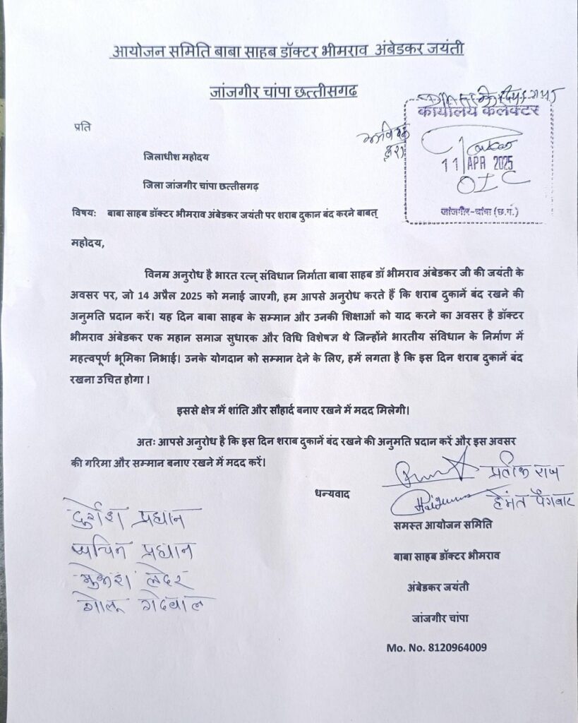 14 अप्रैल 2025 को विश्व रत्न , भारत के सविधान निर्माता , भारत के ज्ञान के प्रतिक जिनको केवल भारत ही नहीं पूरा विश्व शिक्षा के नाम से जानता है , ऐसे महा पुरुष बाबा साहेब भीमराव आंबेडकर जी के जयंती पर्व पर जांजगीर के बाबा साहब ड़ॉ आंबेडकर जयंती आयोजन समिति जांजगीर छत्तीसगढ़ ने शराब दुकान बंद करने के लिए दिया आवेदन दिया है क्यूंकि शराब वर्तमान में सभी आयोजनों में बाधा उत्पन्न करती है शराबी, और हुड़दंगों की कमी नहीं है लेकिन सभी शराब पर ही निहित है अगर इन लोगो को शराब मिलेगा ही नहीं तो ये पिएंगे कहा से और नहीं पिएंगे तो कोई घटना भी नहीं होगी और कार्यक्रम भी सफलता पूर्वक संपन्न होगा। इसलिए बाबा साहब के जन्म जयंती को सुगम और सफल मनाने के लिए समिनित ने रैली निकाल कर बाबा साहब के प्रतिमा स्थल तक पहुंचने का योजना बनाया है और शराब दुकान को जयंती के दिन बंद रखने के लिए आवेदन माननीय कलेक्टर महोदय को सौपा है पूर्व में भी गाँधी जयंती , कबीर जयंती , गुरु घासीदास जयंती , और अन्य आयोजनों में बंद रहा है जिसके कारण कार्यक्रम सफल रहा है।