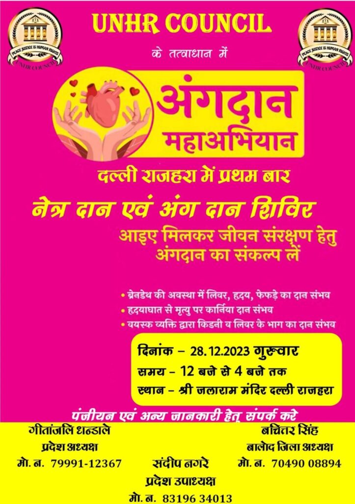 दल्लीराजहरा। देश के अग्रणी समाजसेवी संस्था UNHR कॉउन्सिल के छत्तीसगढ़ इकाई के द्वारा दल्ली राजहरा शहर में प्रथम बार अंगदान एवं नेत्रदान का शिविर आयोजन किया जा रहा है। शिविर 28 दिसंबर को श्री जलाराम मंदिर में आयोजित किया जा रहा है। संस्था की प्रदेश अध्यक्ष गीतांजलि धन्डाले ने बताया कि इस शिविर को आयोजित करने के पीछे संस्था का उद्देश्य मानव सेवा के माध्यम से छत्तीसगढ़ राज्य को अग्रणी बनाना है ।दल्ली राजहरा में पहली बार इस तरह के अनूठे आयोजन में क्षेत्र के साथ-साथ आसपास के ग्रामीण क्षेत्र के लोगों को भी इस महा अभियान से जोड़ने का प्रयास किया जा रहा है। इस अभियान के अंतर्गत लोगों को देहदान एवं नेत्रदान के संकल्प पत्र को भरकर समिति के माध्यम से जिला प्रशासन व स्वास्थ्य विभाग को सौपा जावेगा। इस शिविर में अंगदान एवं नेत्रदान करने के लिए इच्छुक व्यक्ति अपना पंजीकरण करवा इस महाभियान का हिस्सा बन सकता है। पंजीकरण हेतु 7999112367, 70490 08894 नंबर पर संपर्क कर सकते है।