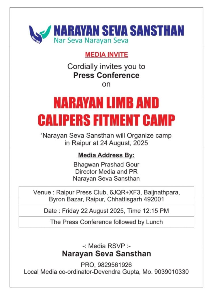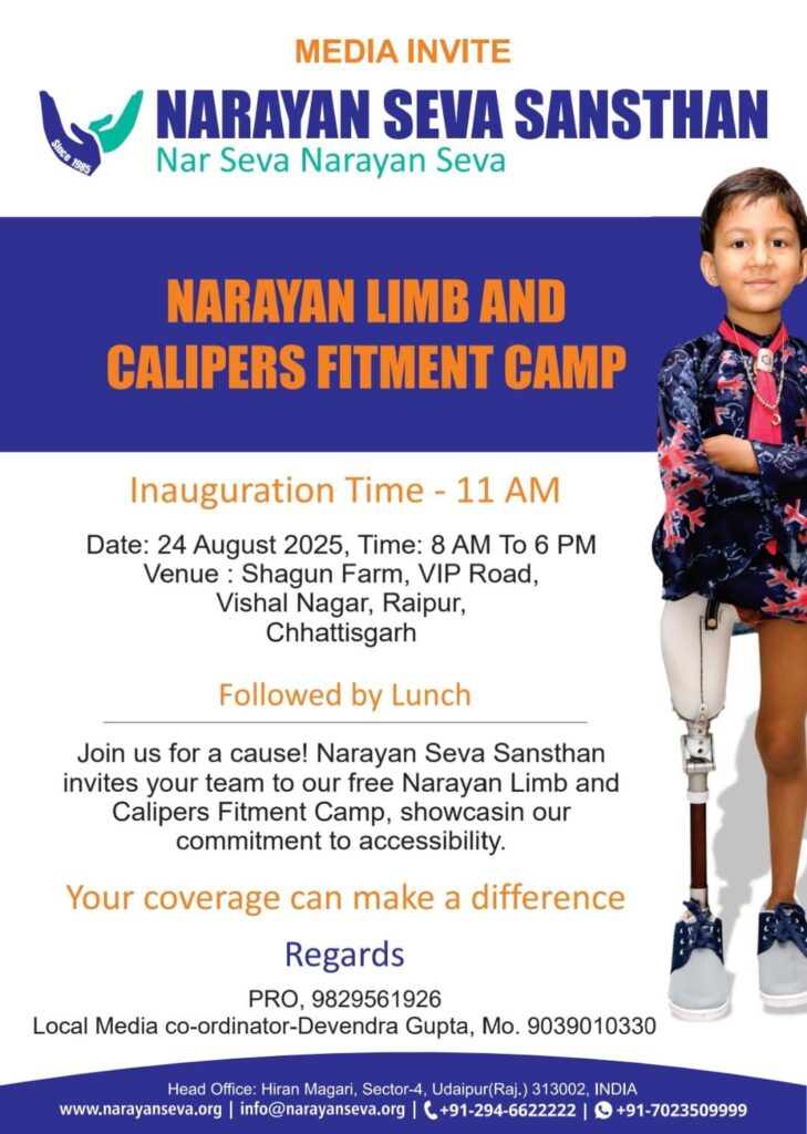 नारायण सेवा संस्थान का नारायण लिंब फिटमेंट कैम्प 24 अगस्त को.. छत्तीसगढ़ के 382 से अधिक दिव्यांगों को निःशुल्क कृत्रिम हाथ-पैर से मिलेगी आसान जिंदगी की सौगात