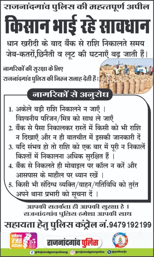 राजनांदगांव पुलिस द्वारा पंपलेट चस्पा कर किसानों व नागरिकों को धान बिक्री के बाद बैंक से राशि निकालते समय होने वाली जेब-कतरा, छिनैती एवं लूट जैसी घटनाओं के प्रति सतर्क रहने की अपील की गई है।