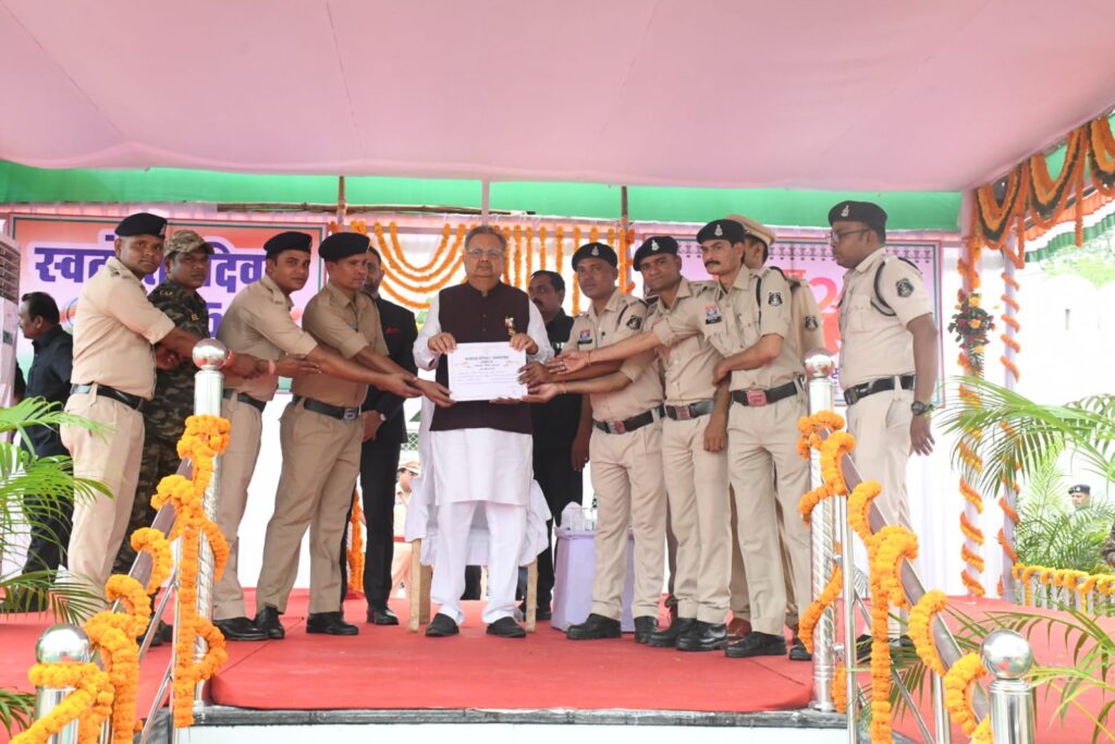 स्वतंत्रता दिवस के अवसर पर पुलिस प्रशिक्षण विद्यालय (पीटीएस) राजनांदगांव में मुख्य ध्वजारोहन समारोह का आयोजन किया गया जिसमें मुख्य अतिथि छत्तीसगढ़ विधानसभा अध्यक्ष माननीय डॉ0 रमन सिंह द्वारा ध्वजारोहन कर सलामी ली गई। इस दौरान परेड़, स्कूली बच्चों द्वारा सांस्कृतिक कार्याक्रम किया गया तत्पश्चात् माननीय मुख्य अतिथि द्वारा पुरस्कार वितरण किया गया जिसमें पुलिस विभाग के अधिकारी/कर्मचारियों को उत्कृष्ट कार्य करने के फलस्वरूप थाना डोंगरगांव प्रभारी निरीक्षक जितेन्द्र वर्मा, सायबर सेल प्रभारी निरीक्षक विनय पम्मार, प्रभारी सीसीटीएनएस प्र.आर. हिरेन्द्र साहू, थाना डोंगरगढ़ से प्र.आर. राणा प्रसन्ना, थाना बसंतपुर से प्र.आर. दीपक जायसवाल, प्रभारी डायल 112 थानसिंह, थाना बोरतलाव से प्र.आर. रोहित पडौती, डीआरजी से प्र.आर. बोदी कुरसाम, रक्षित केन्द्र से प्र.आर. संतोष नंदेश्वर, यातायात शाखा से प्र.आर.रोहित गजेन्द्र, पुलिस नियंत्रण कक्ष से प्र.आर. मिलन सिंह, थाना आजाक से म.प्रा.आर. मीना विश्वकर्मा, एसडीओपी कार्यालय डोंगरगांव से म.प्र.आर. डोमेश्वरी साहू, पुलिस चौकी तुमडीबोड़ से चंद्रकली कंवर, एसडीओपी कार्यालय डोंगरगढ़ से आर. रामनारायण साहू, आईयूसीएडब्ल्यू से म.आर. जया साहू, रीडर-1 शाखा से आर. कुलदीप यादव, पुलिस चौकी चिखली से आर. किशोर कुमार मार्बल, सायबर सेल से आर. अमित सोनी, परिवेश वर्मा, थाना कोतवाली से आर. शंकर मरकाम, यातायात शाखा से आर सुभाष रात्रे, महिला थाना से म.आर. रेणुका साहू, थाना लालबाग सेम.आर अंजना मेश्राम, पुलिस चौकी चिचोला से आर. सुनील गावड़े, थाना गैंदाटोला से आर. मोहित साहू, थाना लालबाग से आर. बर्मा प्रसाद, डीआरजी से आर. कमलेश धु्रव, रक्षित केन्द्र, डीएसएफ से आर. उपेन्द्र विश्वकर्मा को प्रशस्ति पत्र व स्मृति चिन्ह भेंट कर पुरस्कृत की गई। संपूर्ण जिले में हर्षाेउल्लास के साथ स्वतंत्रता दिवस मनाया गया।