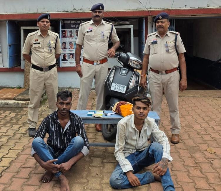 वरिष्ठ पुलिस अधीक्षक से इस संबंध में मिली विस्तृत जानकारी के अनुसार गत दिवस थाना भिलाई नगर पुलिस को सूचना प्राप्त हुई कि दो व्यक्ति स्कूटी क्रमांक सीजी 08 बीडी 7953 में अवैध मादक पदार्थ गांजा लेकर राजनांदगांव से भिलाई पावर हाउस की ओर आ रहे हैं। सूचना पर सेक्टर 07-08 चौक गैरेज रोड़ भिलाई में वाहन चेकिंग के दौरान स्कूटी सुजुकी एक्सेस क्रमांक सीजी 08 बीडी 7953 में दो व्यक्ति आये। जिन्हे रोककर नाम पता पुछने पर उन्होंने अपना नाम हेमंत बमभोले उर्फ भोला और अक्षत सिंडे बताया। उक्त वाहन का तलाशी लेने पर स्कूटी की डिक्की के अंदर रखे पीला कत्था संफेद रंग के कपड़े के झोला अंदर अवैध मादक पदार्थ गांजा वजनी 01.150 किलोग्राम मिला। मादक पदार्थ गाँजा और घटना में प्रयुक्त स्कूटी एक्सेस वाहन क्रमांक सीजी 08 बीडी 7953 को पुलिस ने जप्त कर लिया। थाना भिलाई नगर मे अपराध क्रमांक 432/2025 धारा 20(ख ) 27(क) एनडीपीएस. एक्ट का अपराध पंजीबद्ध किया गया। पुलिस ने आरोपीगणों को एनडीपीएस एक्ट के तहत विधिवत गिरफ्तार कर माननीय न्यायालय में पेश किया , जहां से उन्हें न्यायिक रिमाण्ड पर जेल भेज दिया गया।